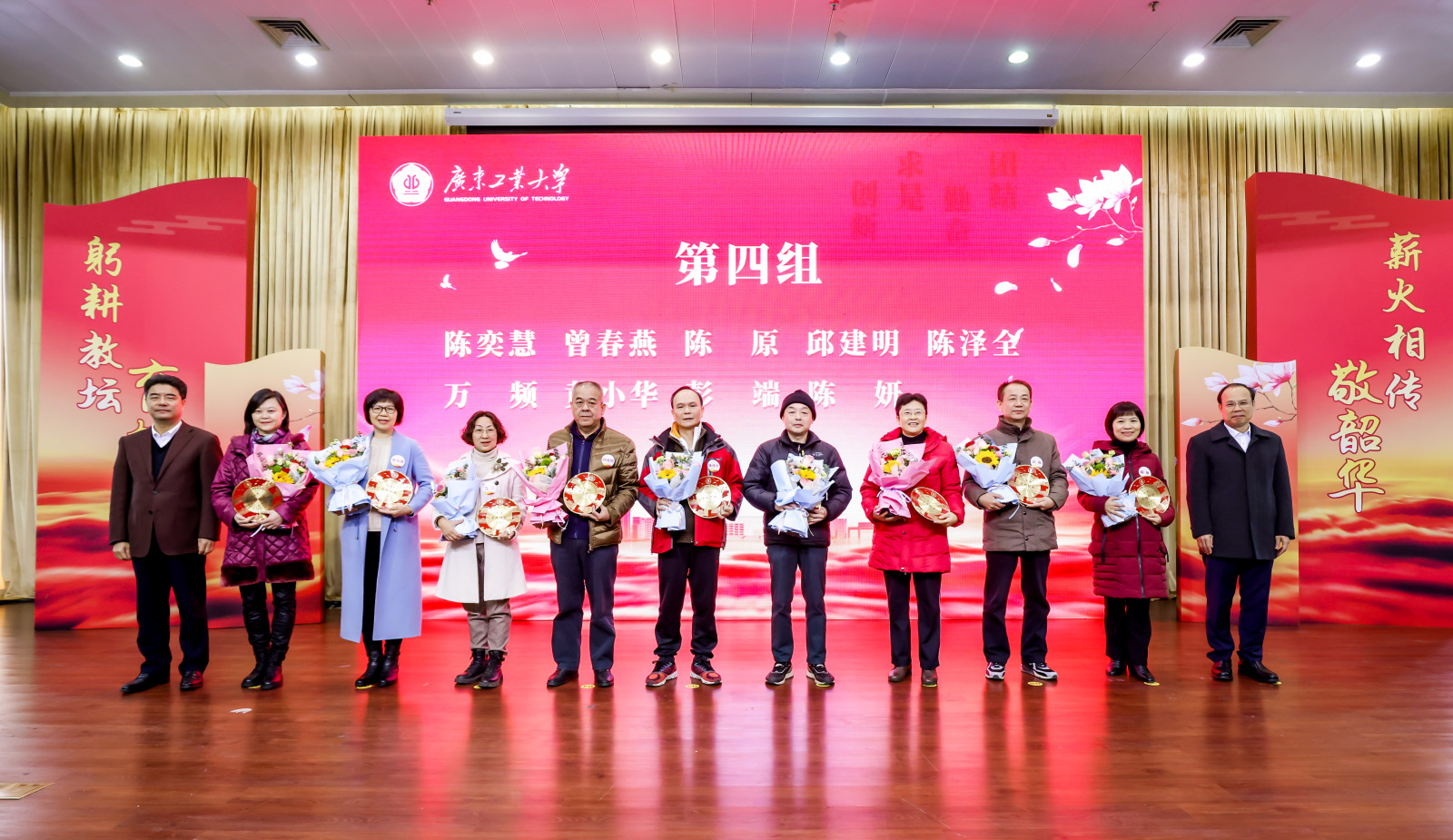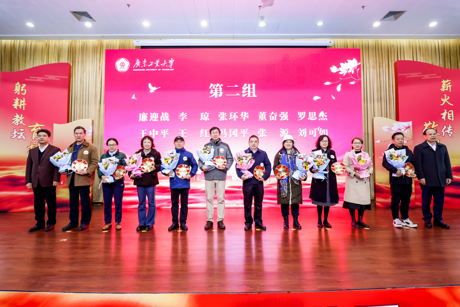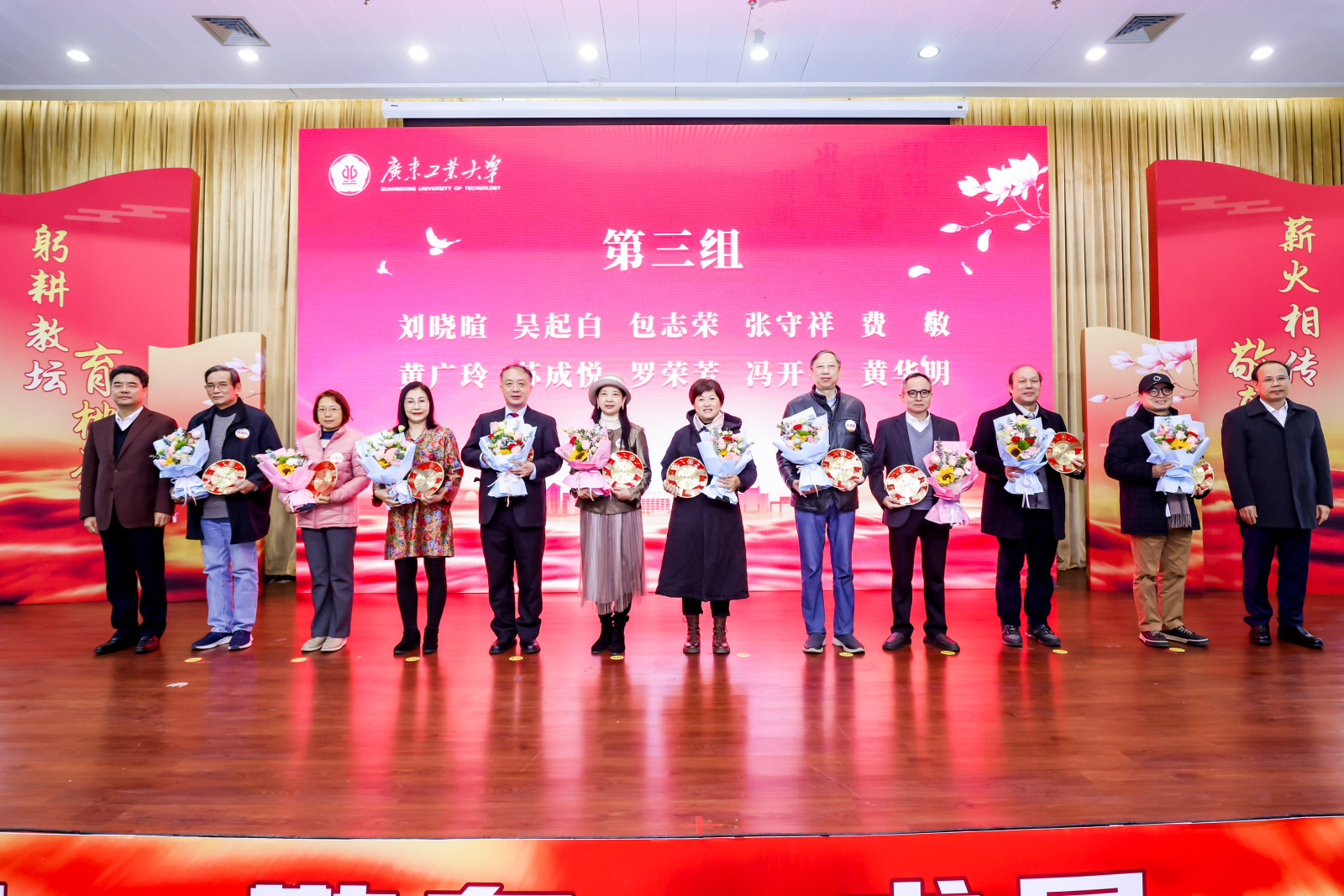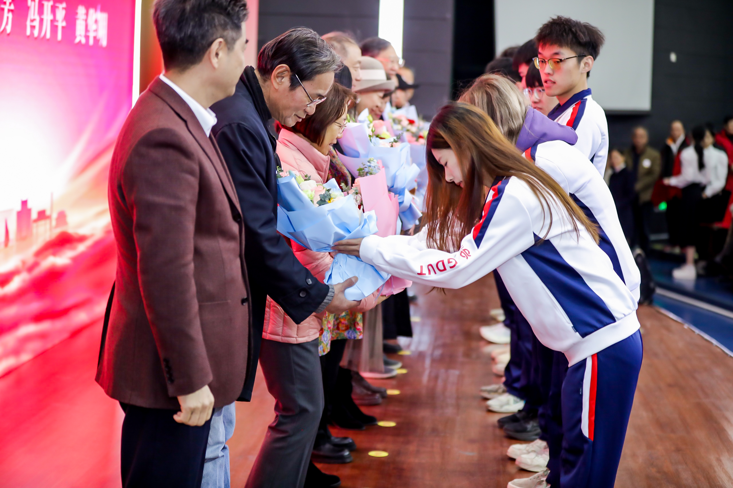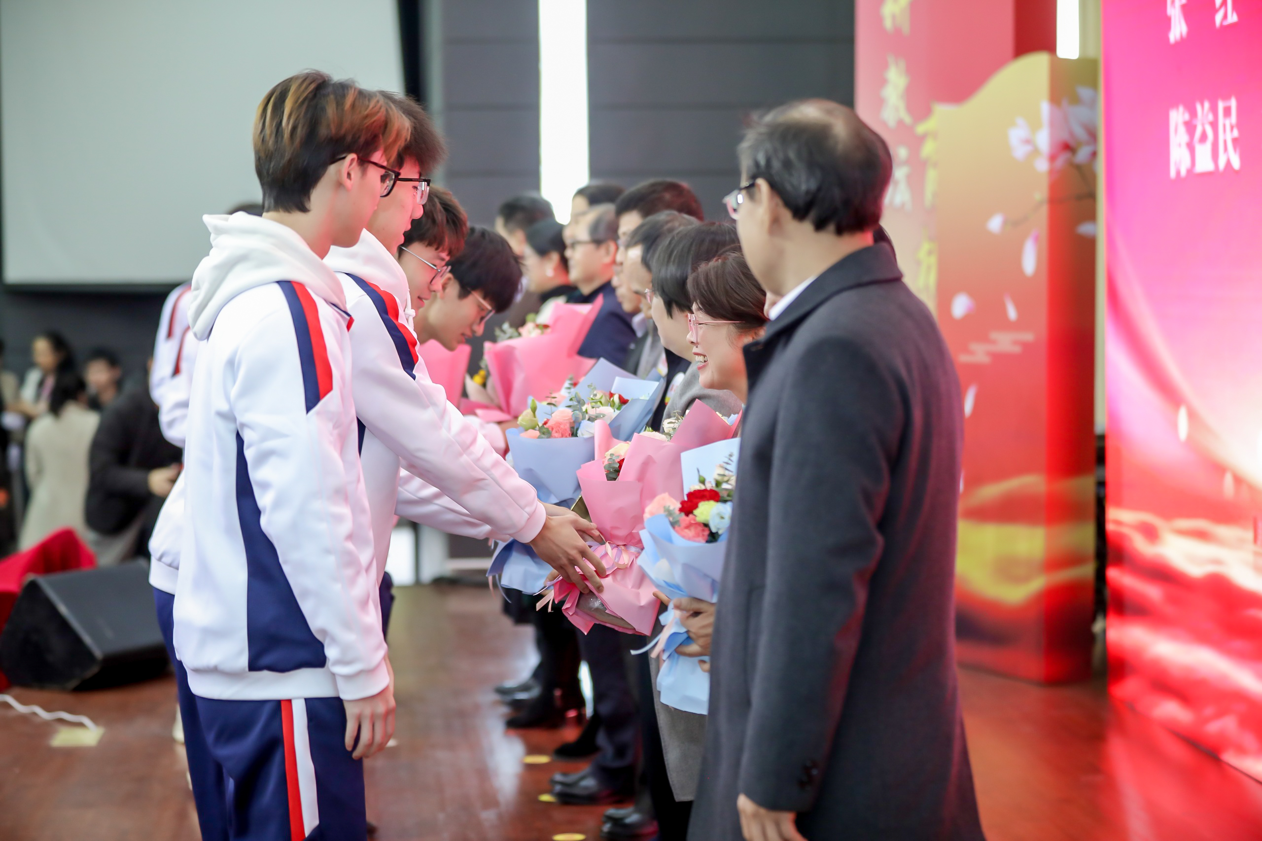 致敬芳华,感恩有您。2023年2月至2023年12月,学校共有120位教职工光荣退休。胡钦太、邱学青为荣休教职工代表颁发纪念牌,学生代表向荣休老师献花。