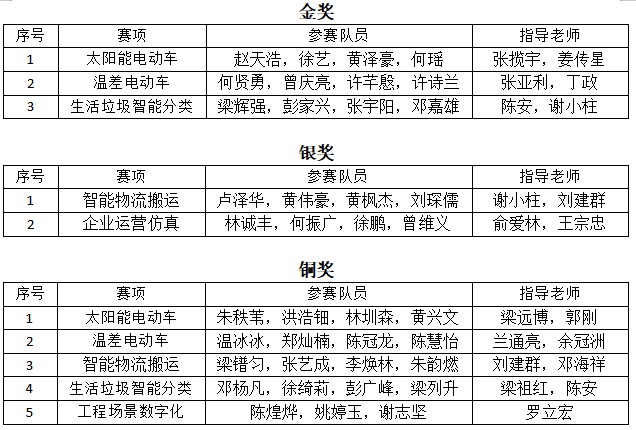 学校派出10支队,共40位优秀学生参加大赛的太阳能电动车、温差电动车、智能物流搬运、生活垃圾智能分类、工程场景数字化和企业运营仿真等六个赛项,通过校赛、省赛和全国总决赛,全方位展现了工大学子的工程实践与创新能力风采。在10月份举办的省赛中,实验教学部、机电工程学院和艺术与设计学院积极组织学生参与,共派出32支队伍参与省赛。经过激烈角逐,学校共有23支队伍获奖,其中省赛一等奖11项,二等奖6项,三等奖6项。