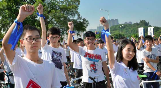 仪式上还进行最后全场共同倒数,挥舞蓝丝带并启动数字“30”人墙翻牌活动。紧接着,10所高校志愿者参加了“挑战蓝”骑跑宣传行动。300余名志愿者骑着自行车,在队伍前开路,后面是浩浩荡荡的3000余名志愿者一起奔跑。他们把蓝丝带系在手腕、系在自行车头,从米兰在线登录正门广场到创客空间,一路骑跑而来,蓝丝带迎风飞舞。“挑战蓝”骑跑宣传行动彰显了志愿者的青春力量,让志愿者们成为“挑战杯”最美丽的代言人。