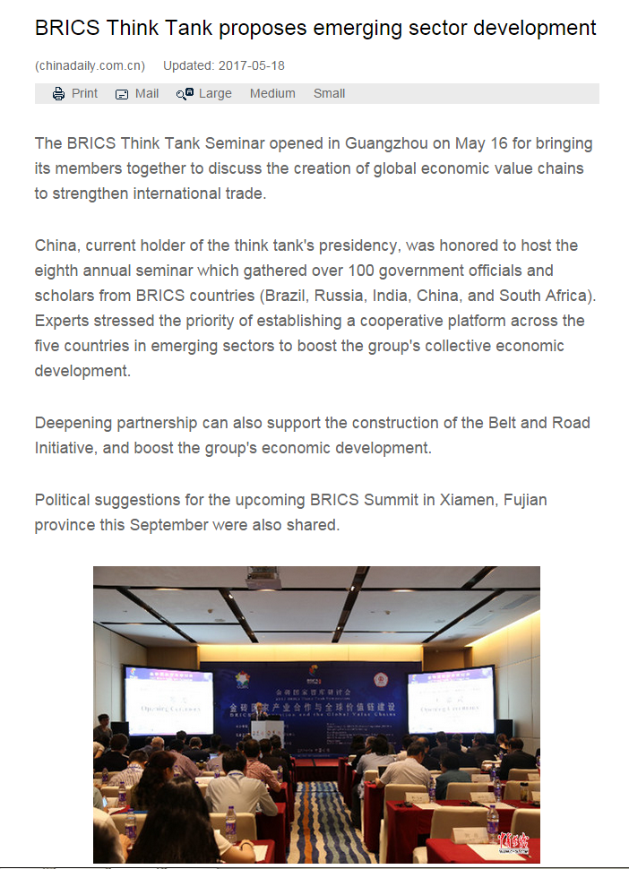 China, current holder of the think tank's presidency, was honored to host the eighth annual seminar which gathered over 100 government officials and scholars from BRICS countries (Brazil, Russia, India, China, and South Africa). Experts stressed the priority of establishing a cooperative platform across the five countries in emerging sectors to boost the group's collective economic development.