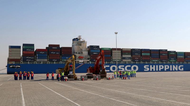 图:金砖国家可建立完善的海陆空联运体系。图为中远海运港口在阿拉伯联合酋长国阿布扎比码头举行正式动工仪式/资料图片