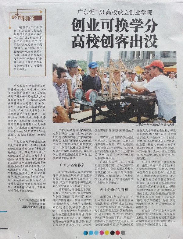 本网讯 广州日报与我校共建栏目“岭南创客”正式开栏。9月18日,广州日报A4版该栏第一篇文章刊出,题为《广东近1/3高校设立创业学院 创业可换学分 高校创客出没》。欢迎更多高校加入该栏目建设,助力创新创业教育。全文转载如下: