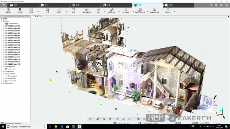 服务团师生在为期四天的工作中,探索了可应用于乡村文化保育的多元数字化技术。对于村落整体格局,采用航拍摄影技术,采集信息并建立三维数字化模型;针对村落中的重要建筑,采用三维激光扫描仪数字化采集记录完整的物质空间信息,获取精确的现状数据,从而为村落的数字化保护和研究建立更精准平台;采用温湿度记录仪,进行内部空间微气候环境监测;采用红外热成像仪检测墙体渗漏情况;采用激光水平仪检测墙柱倾斜情况,从而获取重要建筑的时空信息,为建筑遗产的长期监测保护提供数据支撑。