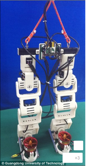 Robotics engineers at Guangdong University of Tech's School of Automation in China strapped two duct fans to the robot's feet which allow it to cross wider distances than it would have been able to previously.